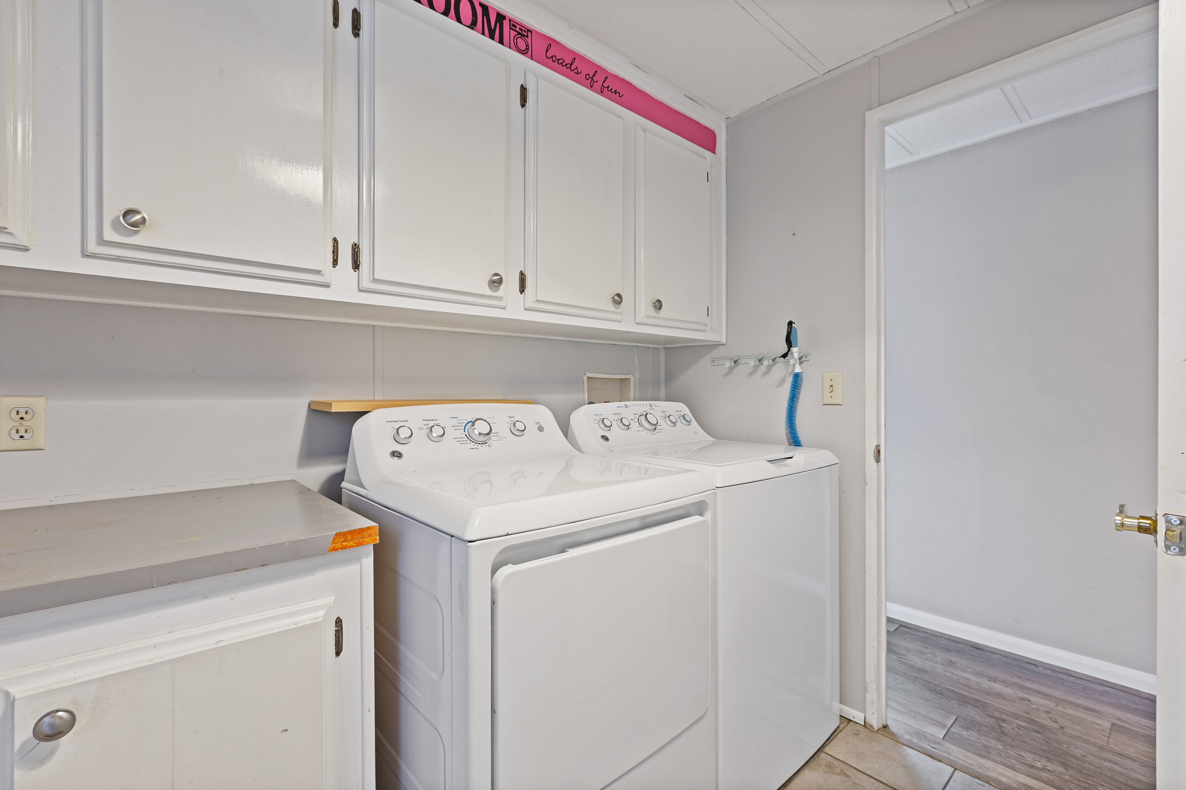- Washer/dryer area, overhead shelf and built-in desk