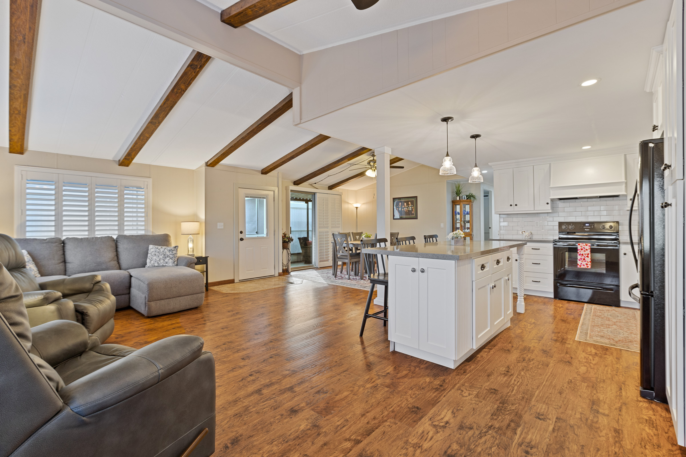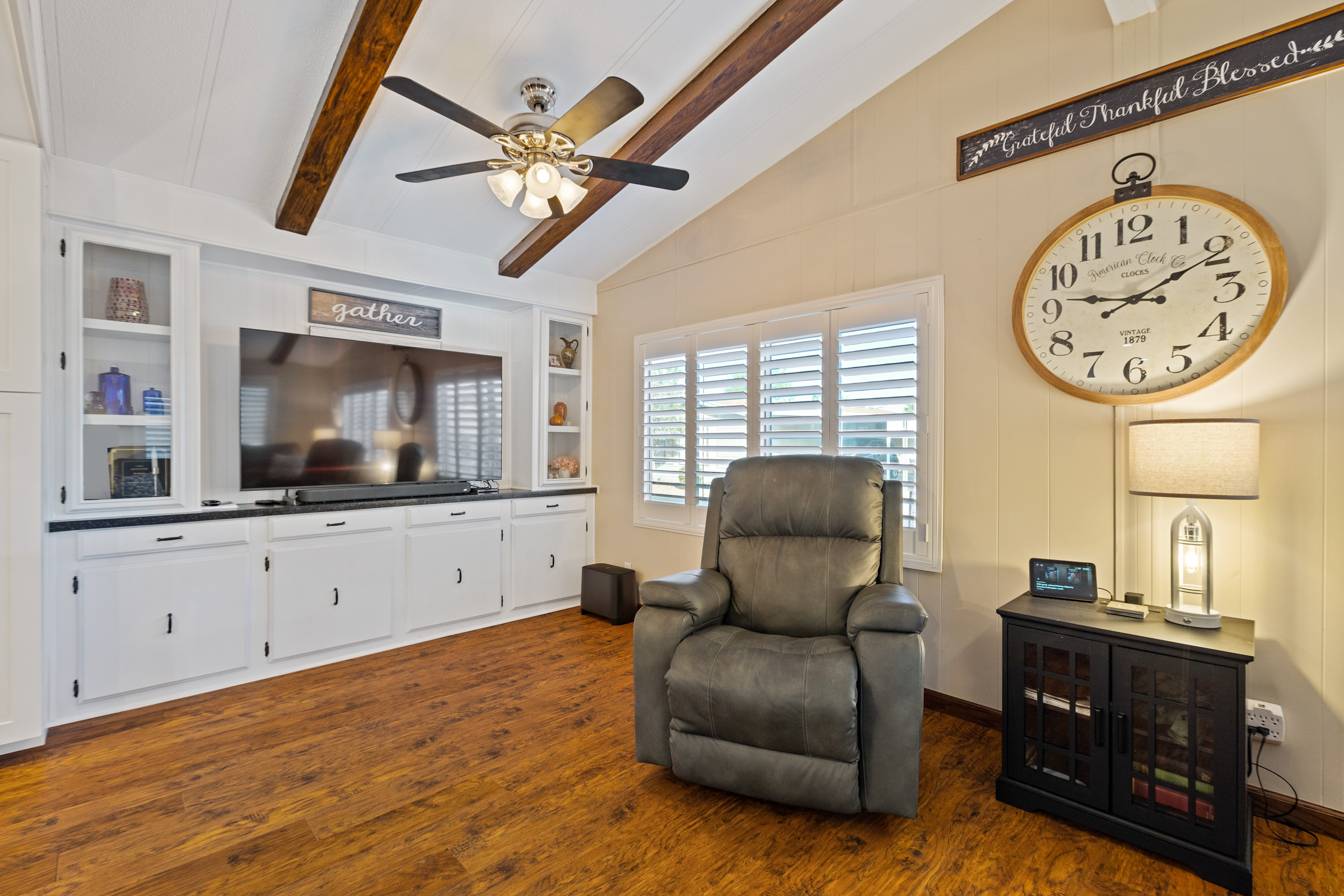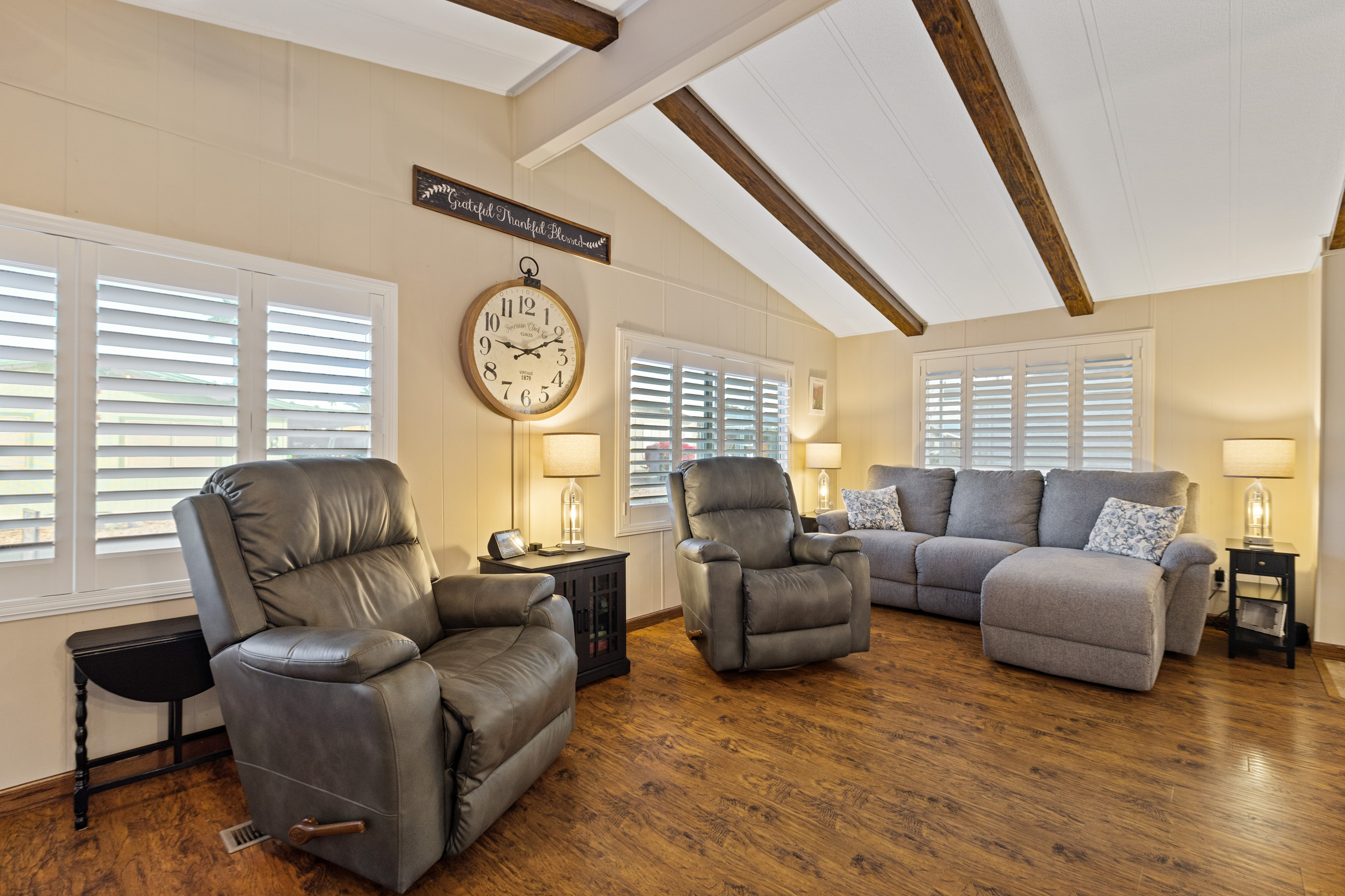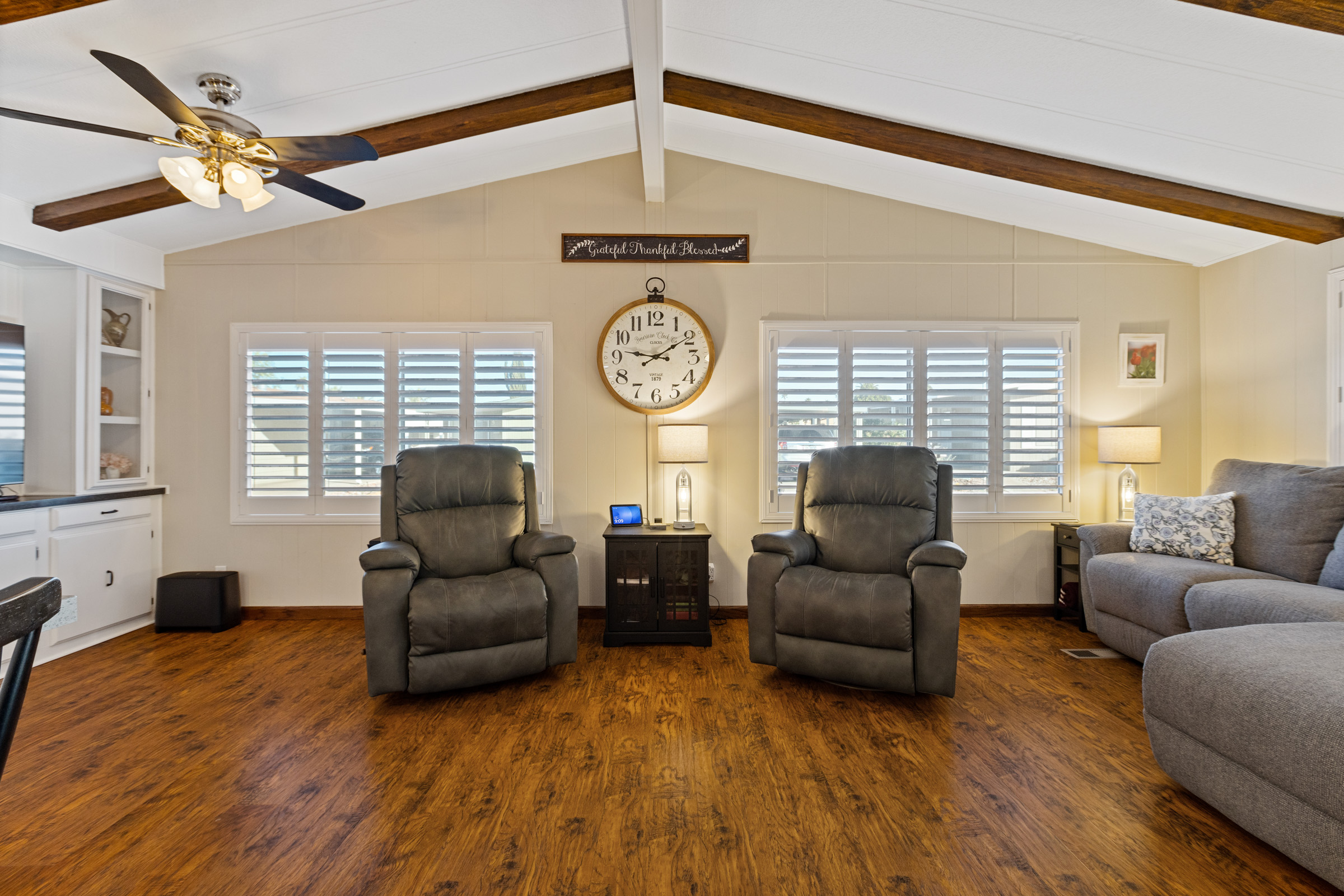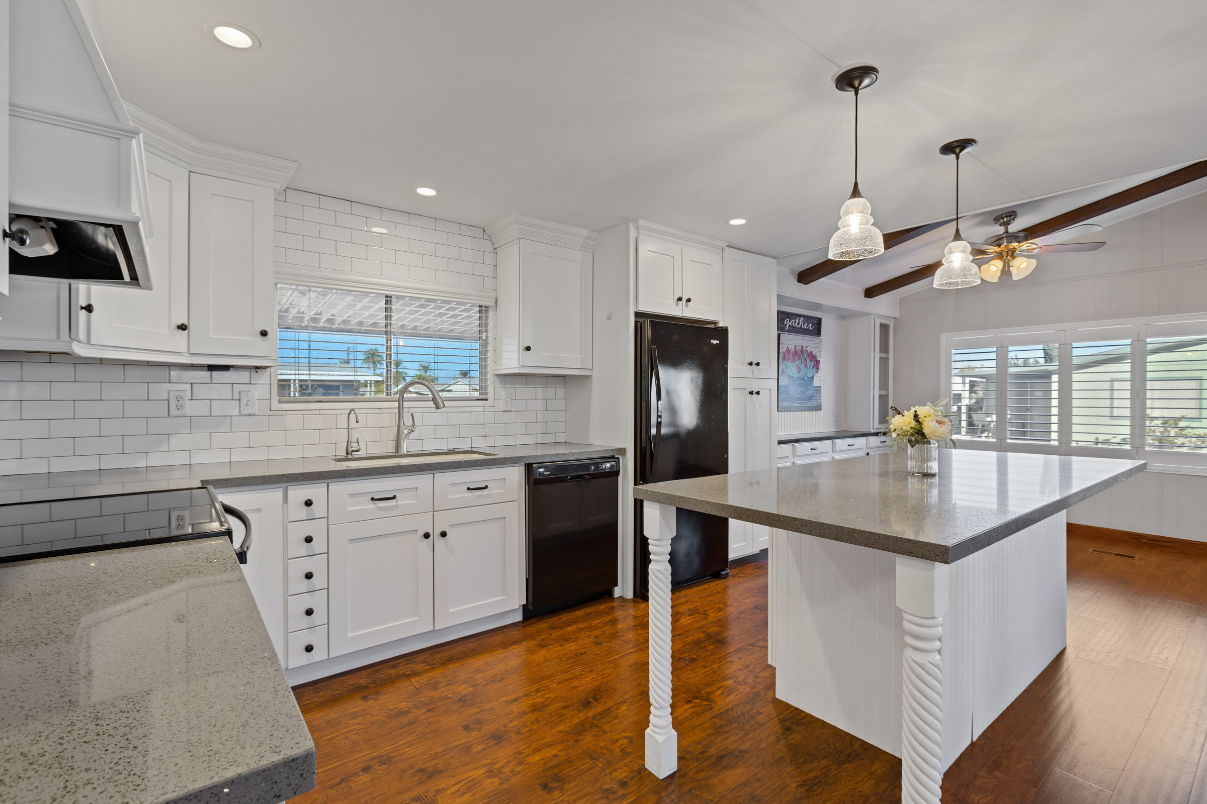This beautifully updated turnkey 2-bedroom, 2-bathroom home offers modern living with style and comfort. The open concept design features a stunning renovated kitchen with a sleek backsplash that extends from the countertop to the ceiling and updated soft closing cabinetry. The spacious living room boasts cathedral ceilings and new plantation shutters, creating a welcoming atmosphere. Enjoy easy to maintain flooring throughout with no carpet. Both bedrooms offer ample space, and the master bathroom has been fully renovated, complete with a stylish barn door. The AZ room with epoxy flooring adds versatility and charm to this home. Don’t miss out!