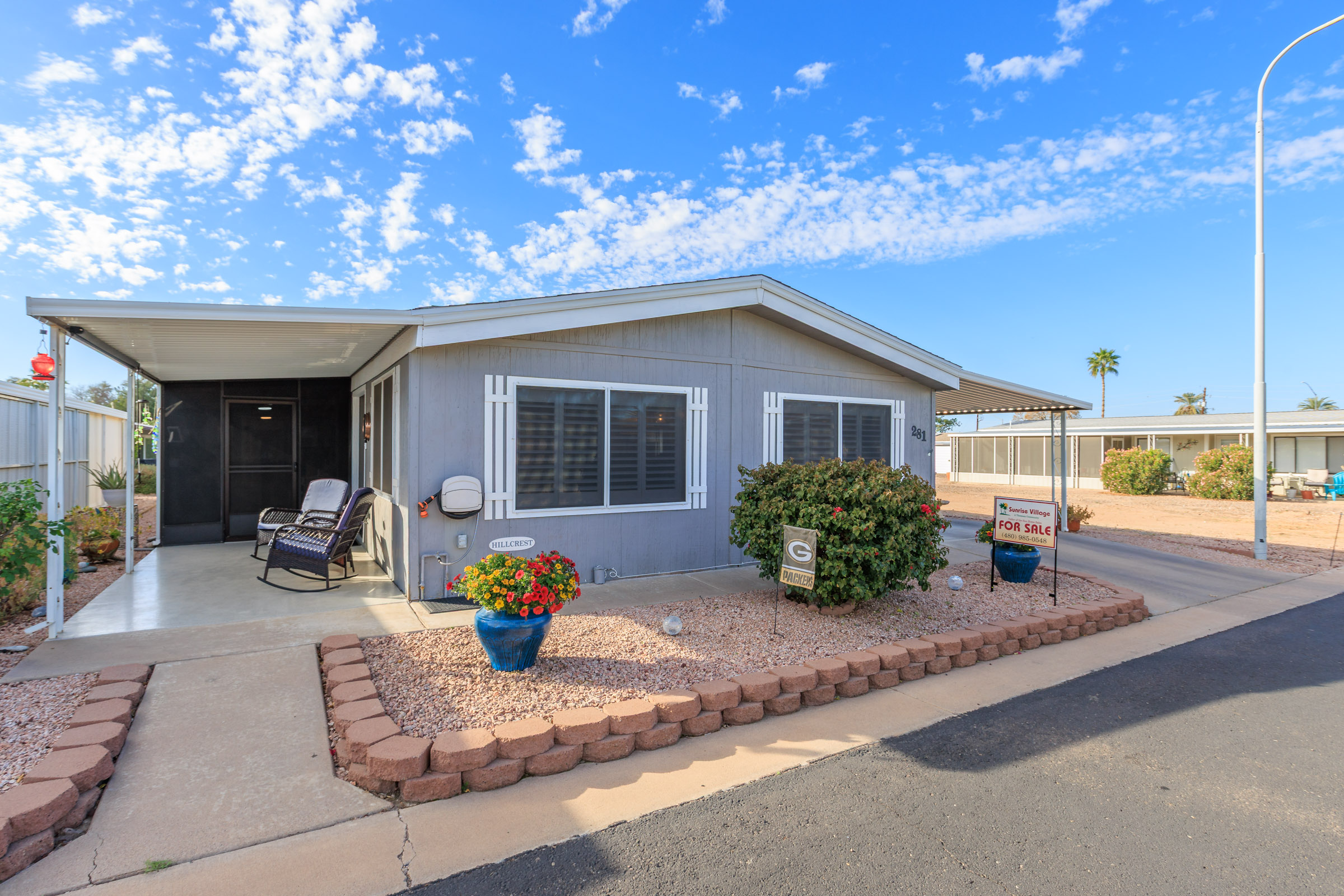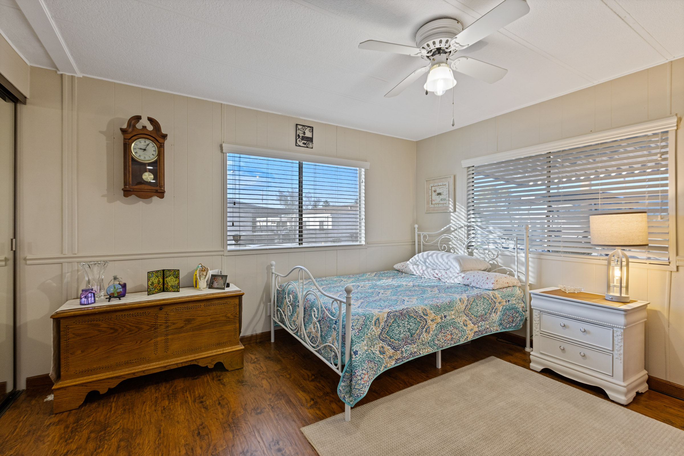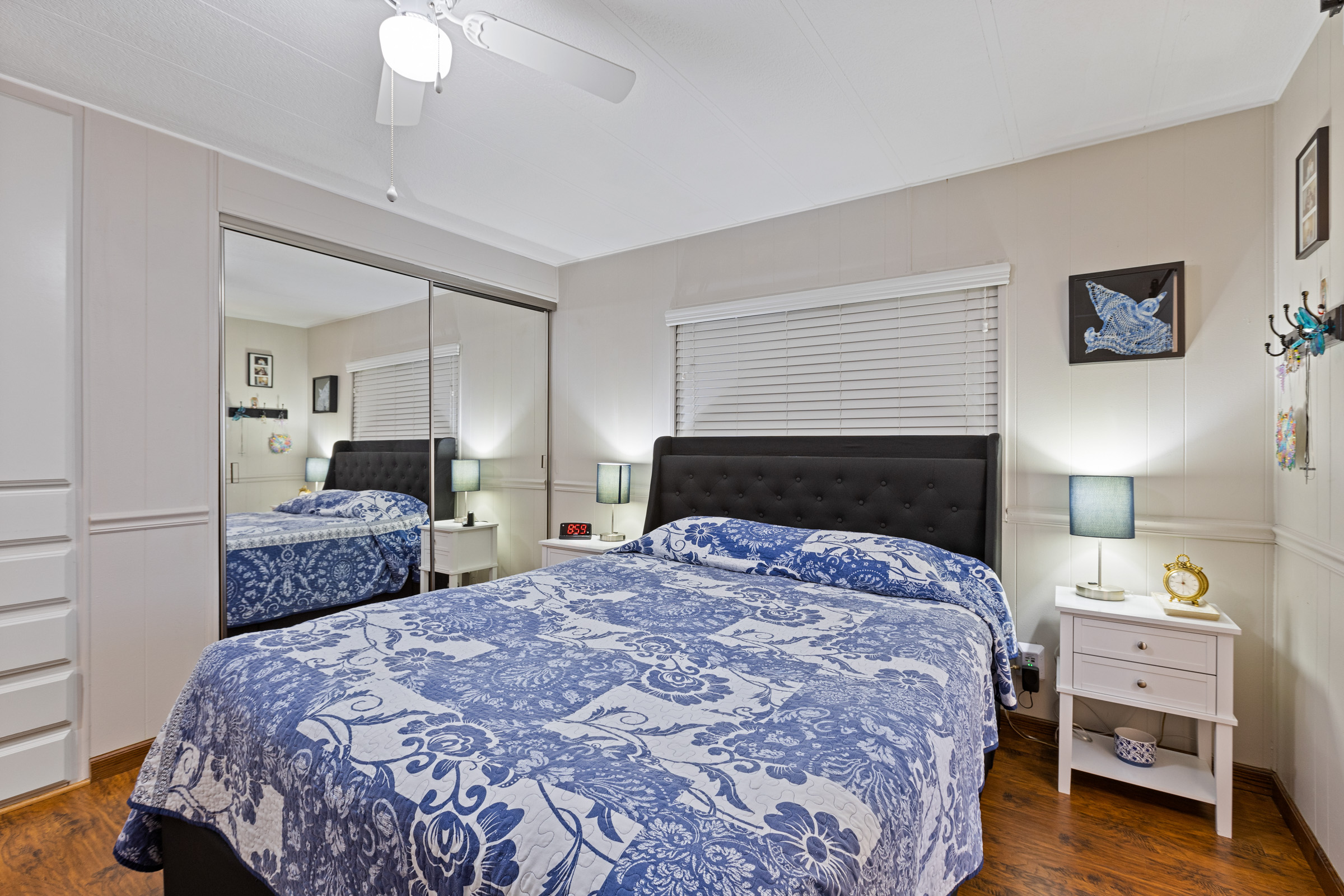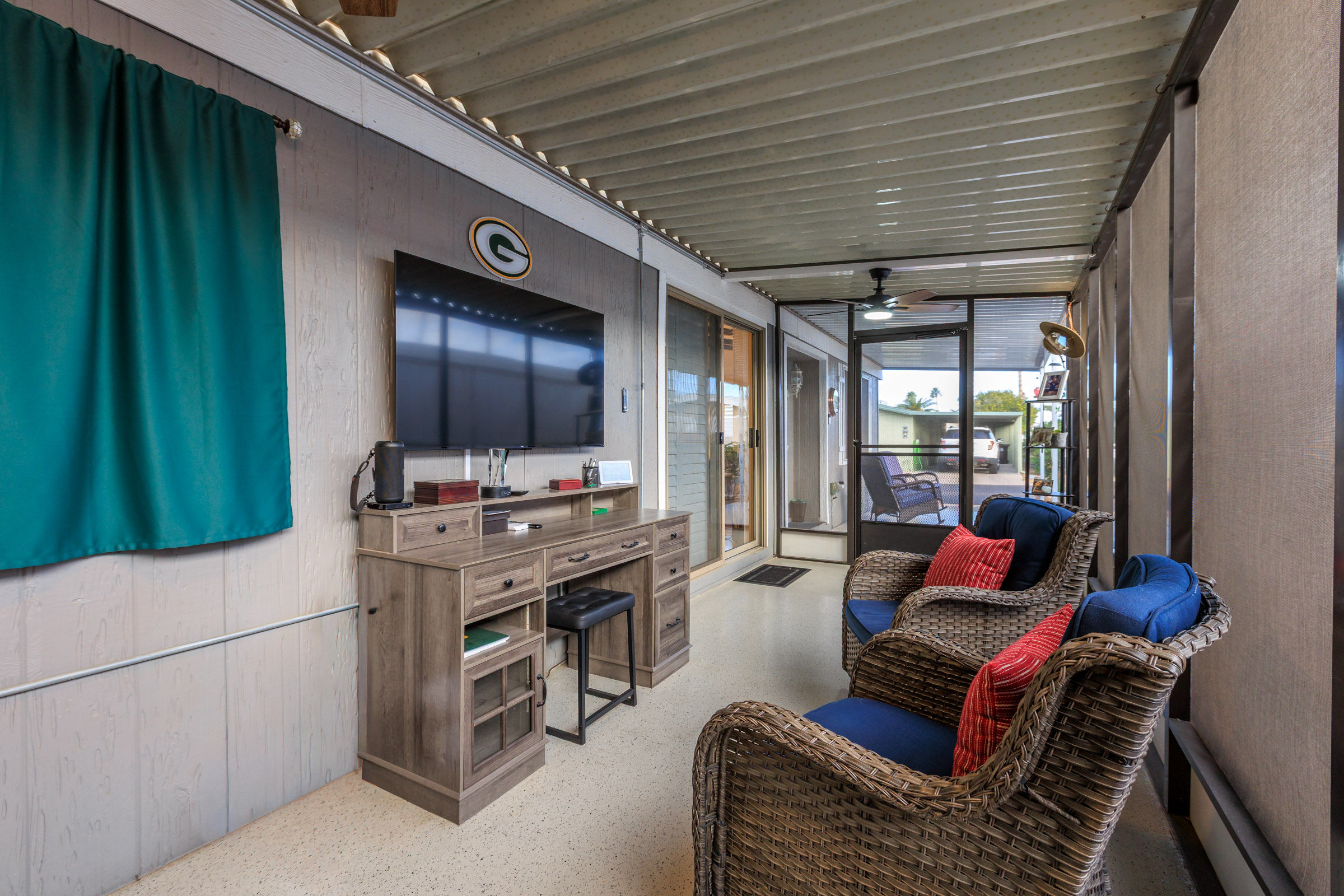 This beautifully updated turnkey 2-bedroom, 2-bathroom home offers modern living with style and comfort. The open concept design features a stunning renovated kitchen with a sleek backsplash that extends from the countertop to the ceiling and updated soft closing cabinetry. The spacious living room boasts cathedral ceilings and new plantation shutters, creating a welcoming atmosphere. Enjoy easy to maintain flooring throughout with no carpet. Both bedrooms offer ample space, and the master bathroom has been fully renovated, complete with a stylish barn door. The AZ room with epoxy flooring adds versatility and charm to this home. Don’t miss out!